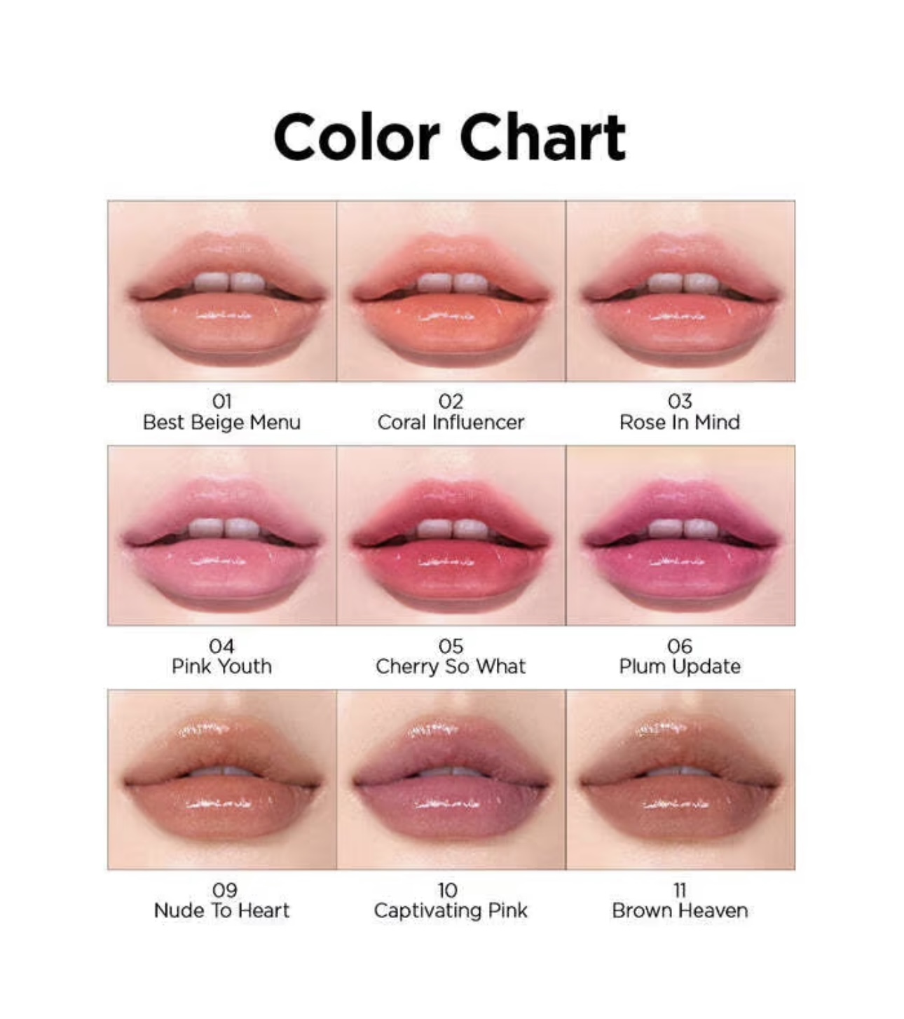 02 Coral Influencer, 03 Rose In Mind, 04 Pink Youth, 05 Cherry So What, 09 Nude To Heart