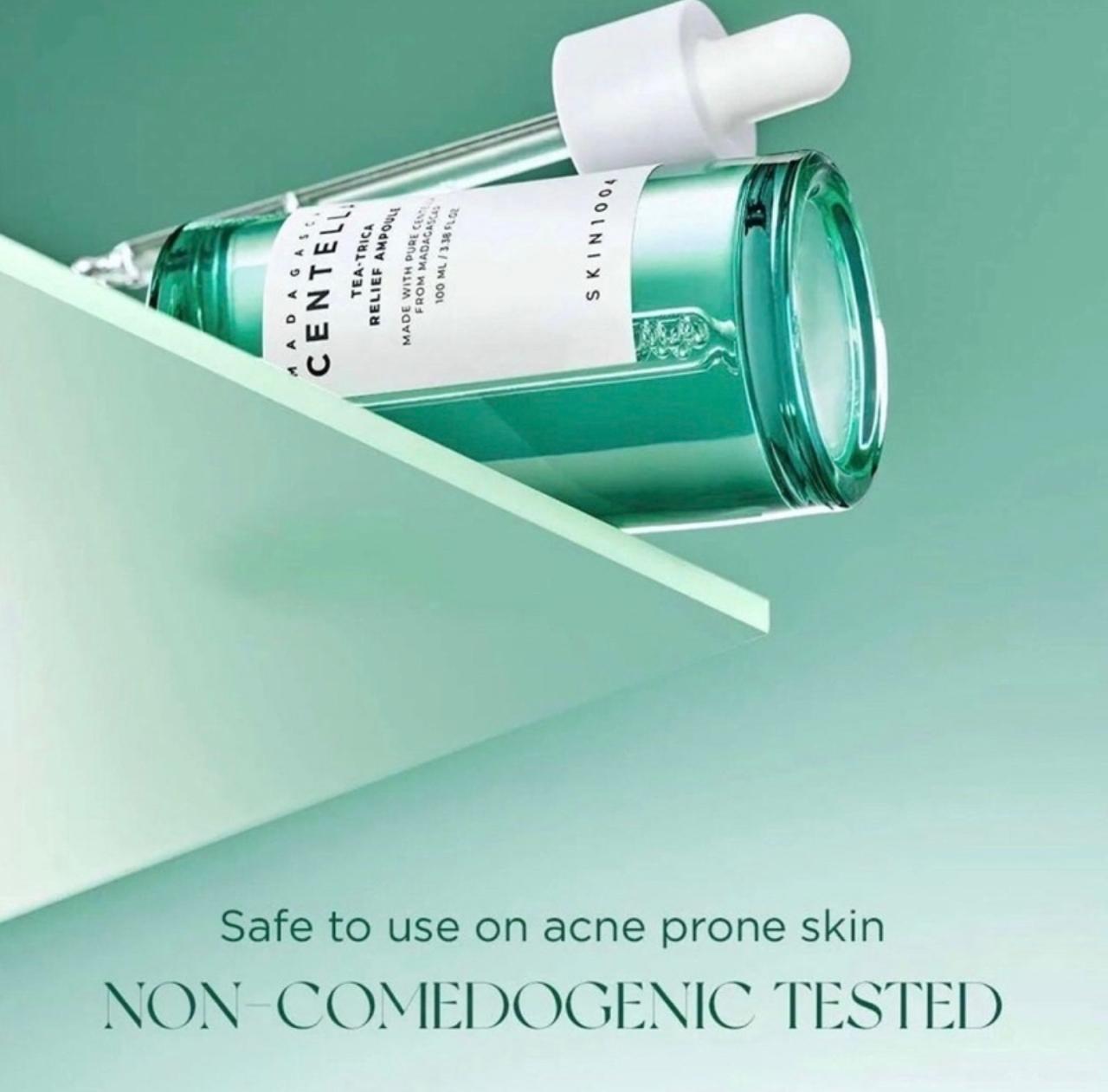 La ampolla está formulada con extracto de centella asiática, que tiene propiedades calmantes y antiinflamatorias, y también contiene extracto de árbol de té, que es conocido por sus propiedades antibacterianas y antiinflamatorias.